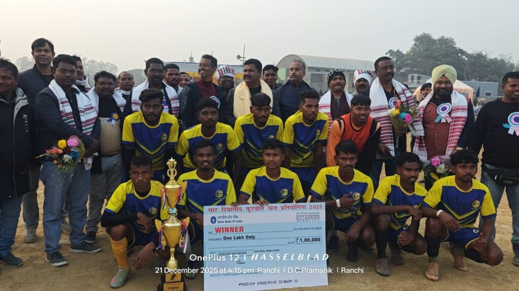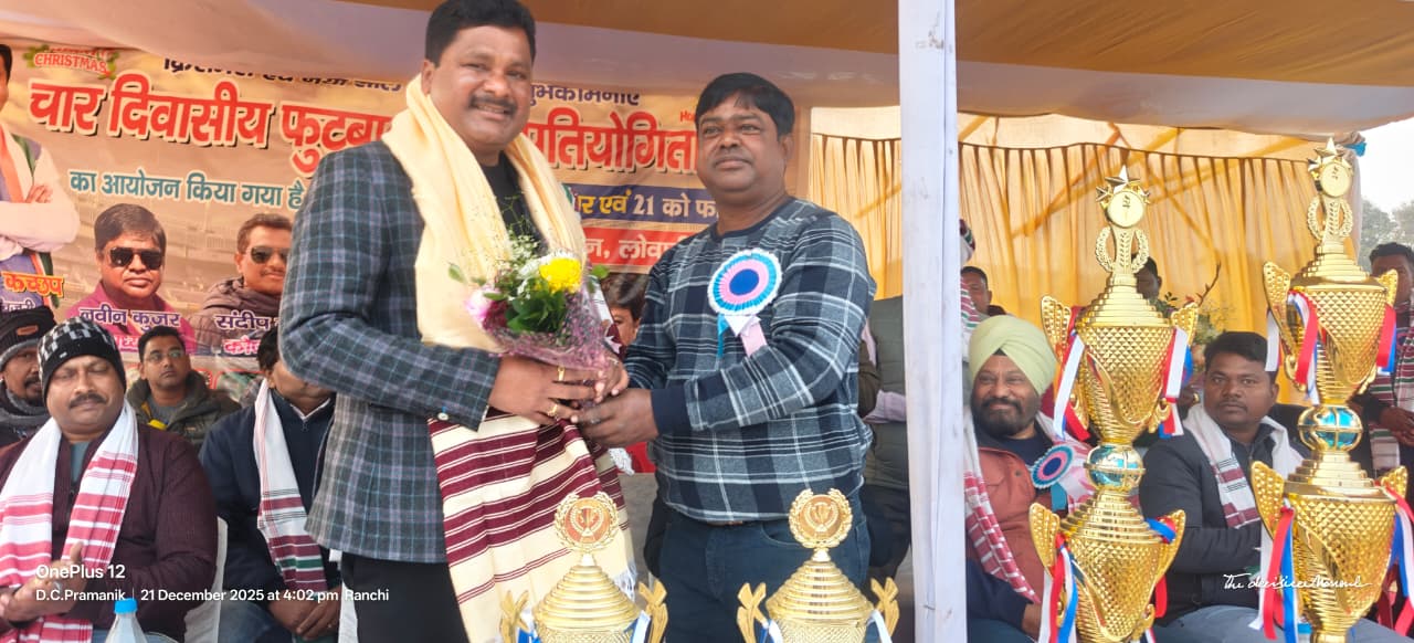 रांची: साइक्लोन क्लब लोवाडीह के तत्वावधान में क्रिसमस एवं नववर्ष के उपलक्ष्य में हाईटेंशन मैदान, लोवाडीह में आयोजित चार दिवसीय फुटबॉल प्रतियोगिता का भव्य समापन हुआ। प्रतियोगिता के फाइनल मैच का उद्घाटन खिजरी विधायक सह कांग्रेस विधायक दल के उप नेता राजेश कच्छप ने कीक मारकर किया।