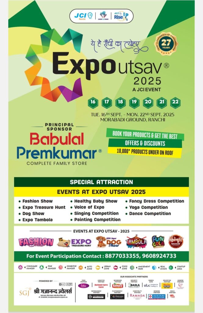 रांची: जेसीआई रांची की ओर 16 से 22 सितंबर तक आयोजित एक्सपो उत्सव में लोगों की अपार भीड़ उमड़ रही रही है। मोरहाबादी मैदान में लगे एक्सपो के दूसरे व तीसरे दिन लोग अपने परिवार संग पहुंच रहे और खरीदारी कर रहे है। लोग देर रात्रि तक खरीदारी करते नजर आ रहे है।