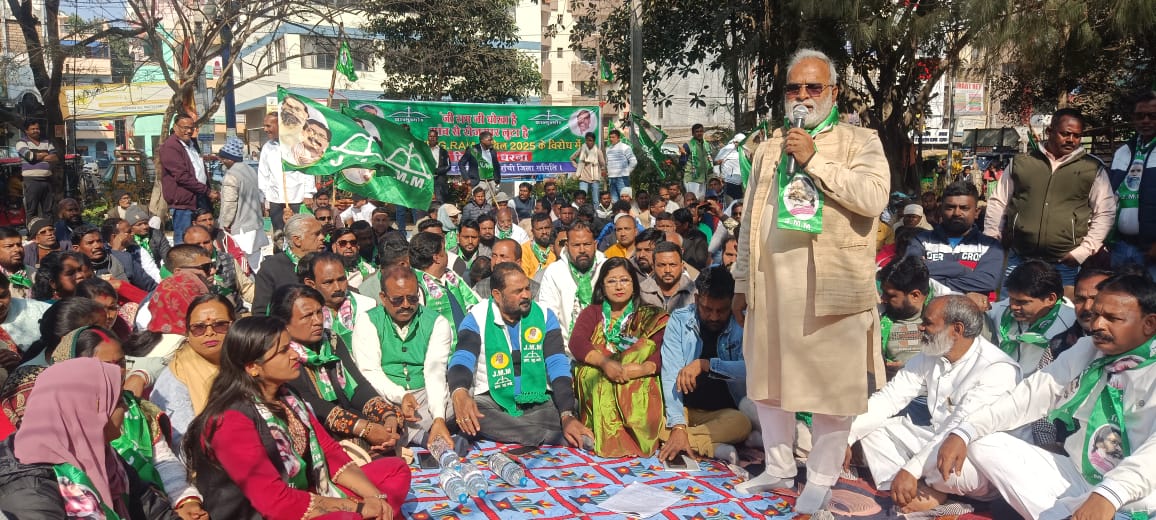 रांची : केंद्र की भाजपा सरकार द्वारा मनरेगा को हटाकर VB-G RAM G बिल पारित कराए जाने के विरोध में झारखंड मुक्ति मोर्चा (झामुमो) रांची जिला समिति ने शुक्रवार को जिला मुख्यालय स्थित नेताजी सुभाष चंद्र बोस पार्क, कचहरी में एकदिवसीय धरना-प्रदर्शन किया। धरना का नेतृत्व जिला संयोजक प्रमुख मुश्ताक आलम ने किया।